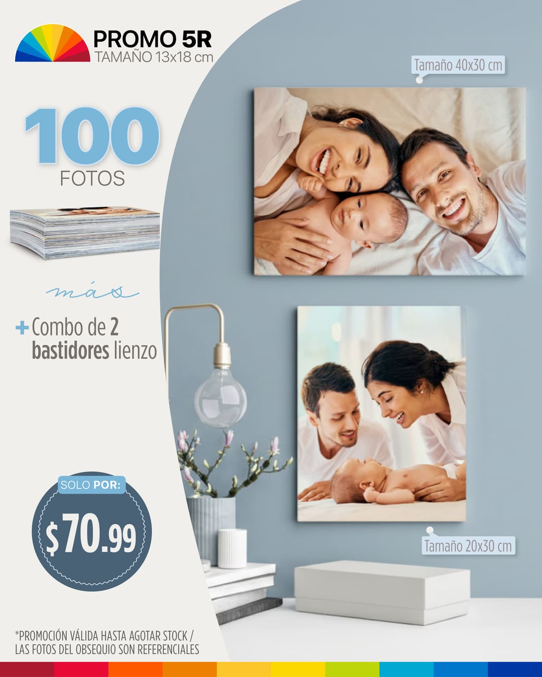 100 fotos 5R (tamaño 12.7×17.8cm) + combo de 2 bastidores lienzo 1 tamaño 20x30cm; 1 tamaño 40x30cm
